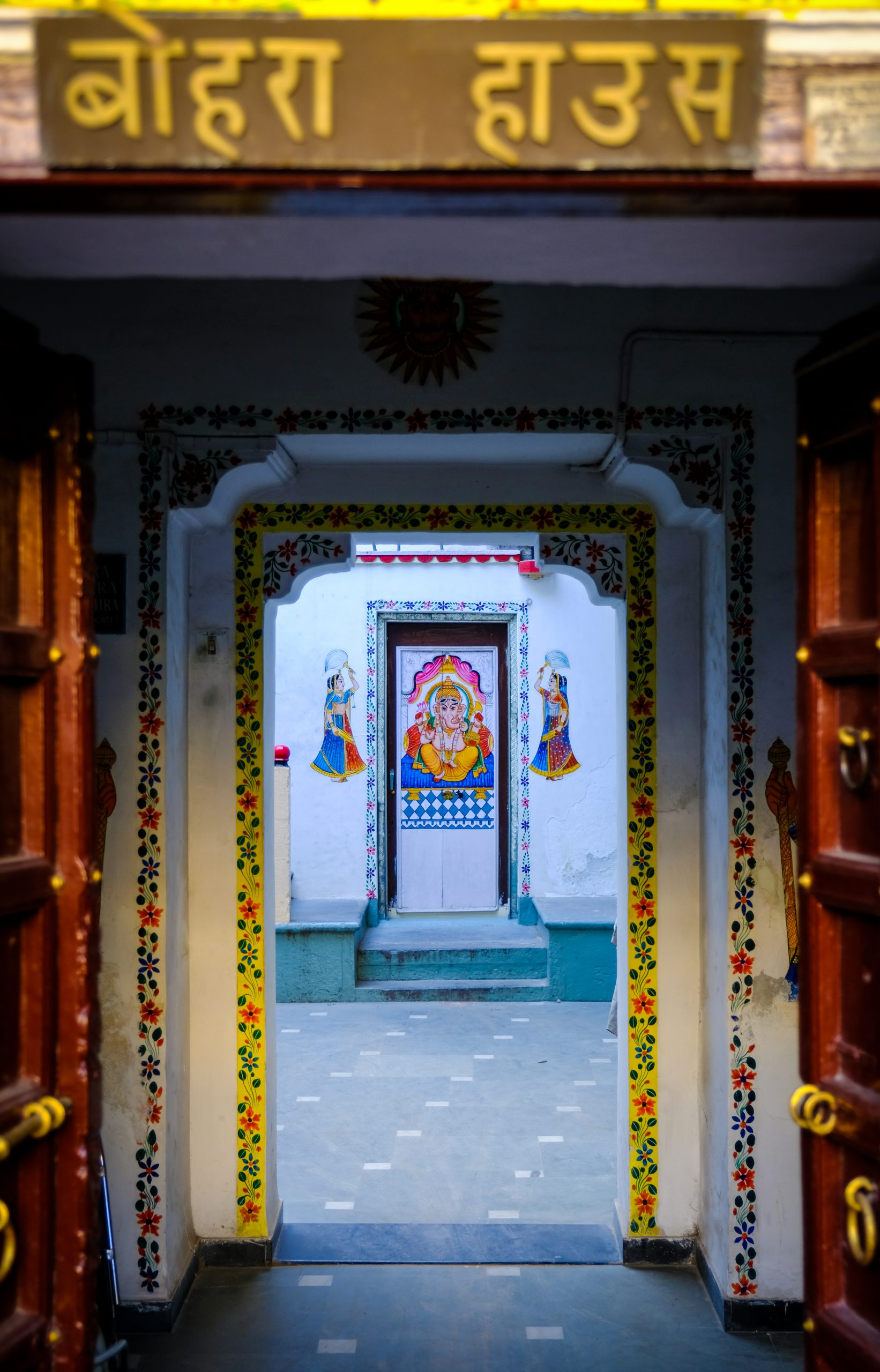 Lối ngõ của Udaipur sạch sẽ thanh lịch. Ngoài các cửa chính có tông màu nổi bật thì trên các bức tường trắng đều được trang trí bằng hình vẽ sinh động. Khuôn viên nhà riêng do chịu nhiều ảnh hưởng của lối thiết kế cung điện triều đại Mewar nên cũng có các khoảng sân lớn chính giữa, cầu thang dẫn lên nhiều phòng và sảnh khác nhau.