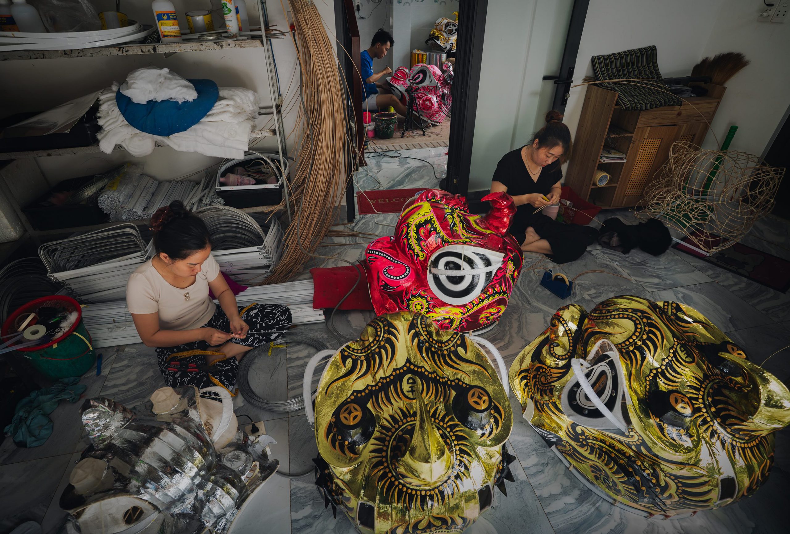 “Xưởng chế tác” đầu lân của Lãm nằm trên đường Trần Hưng Đạo. Gọi là xưởng, thực chất anh tận dụng tầng trệt nhà ở, với khoảng 6 thợ lành nghề là những người trong gia đình và hàng xóm, mỗi người chia nhau làm một công đoạn. Với góp sức theo từng công đoạn, anh đã rút ngắn thời gian làm một đầu lân xuống còn 1 – 2 ngày, thay vì gần nửa tháng như lúc mới vào nghề. Các công đoạn làm đầu lân khá phức tạp, từ tạo khung tre, dán vải, vẽ hoa văn cho đến trang trí lông, phụ kiện mắt, râu. Trong đó, uốn khung sườn là công đoạn quyết định khuôn mặt lân cân đều và khâu vẽ hoa văn là quan trọng nhất để đầu lân toát lên sắc thái thanh thoát, uy nghi.
