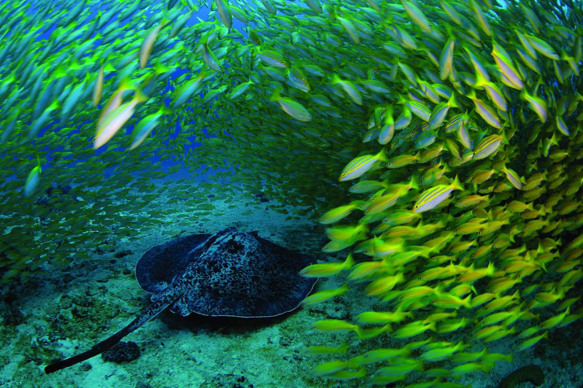 Việc đánh bắt thủy sản quy mô lớn ở Bazaruto được hạn chế từ những năm 1970. Chỉ với một chiếc mặt nạ và ống thở, bạn có thể bơi cùng những đàn cá bạc lấp lánh như cơn lốc thủy ngân dưới ánh mặt trời. Nếu có bằng lặn với bình dưỡng khí, bạn tha hồ đi tìm những chú rùa biển khổng lồ đường kính cả mét nằm nghỉ dưới những vỉa san hô, hay những chú cá đuối có khi còn vĩ đại hơn thế ẩn mình trong cát.