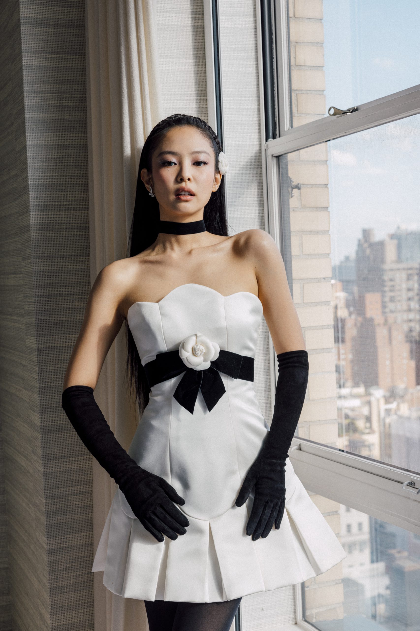 Nữ ca sĩ Jennie Kim diện một chiếc váy cúp ngực sa tanh màu ngà của nữ công tước, tô điểm bằng hoa trà trắng và một dải ruy băng đen từ BST Ready-to-Wear Thu/Đông 1990/91.