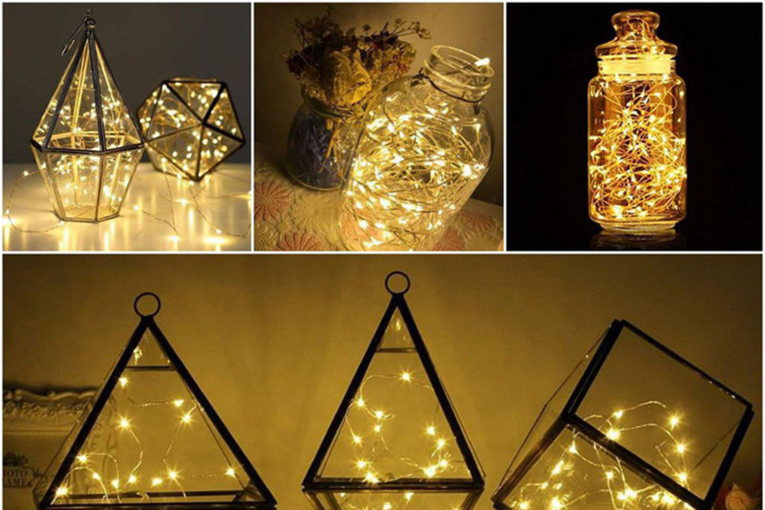 Một cuộn đèn led dạng “fairy lights” là đủ để tạo nên phép màu. Bạn có thể thả một dải đèn vào lọ thủy tinh, vắt nhẹ lên kệ sách hoặc quanh khung gương. Những đốm sáng li ti khiến không gian như được rắc thêm lớp tuyết ánh vàng – lung linh mà không hề tốn công treo móc.