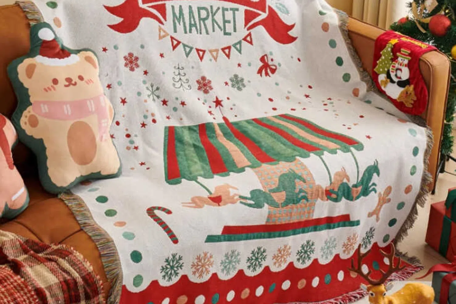 Thêm vào đó, một chiếc chăn len vặn thừng hoặc chăn lông mềm vắt hờ qua thành ghế sẽ khiến không gian trở nên ấm áp và mời gọi hơn. Những chất liệu mềm – ấm – dày này tạo nên cảm giác “tổ kén”, rất phù hợp cho những buổi tối cuộn mình xem phim Giáng sinh.