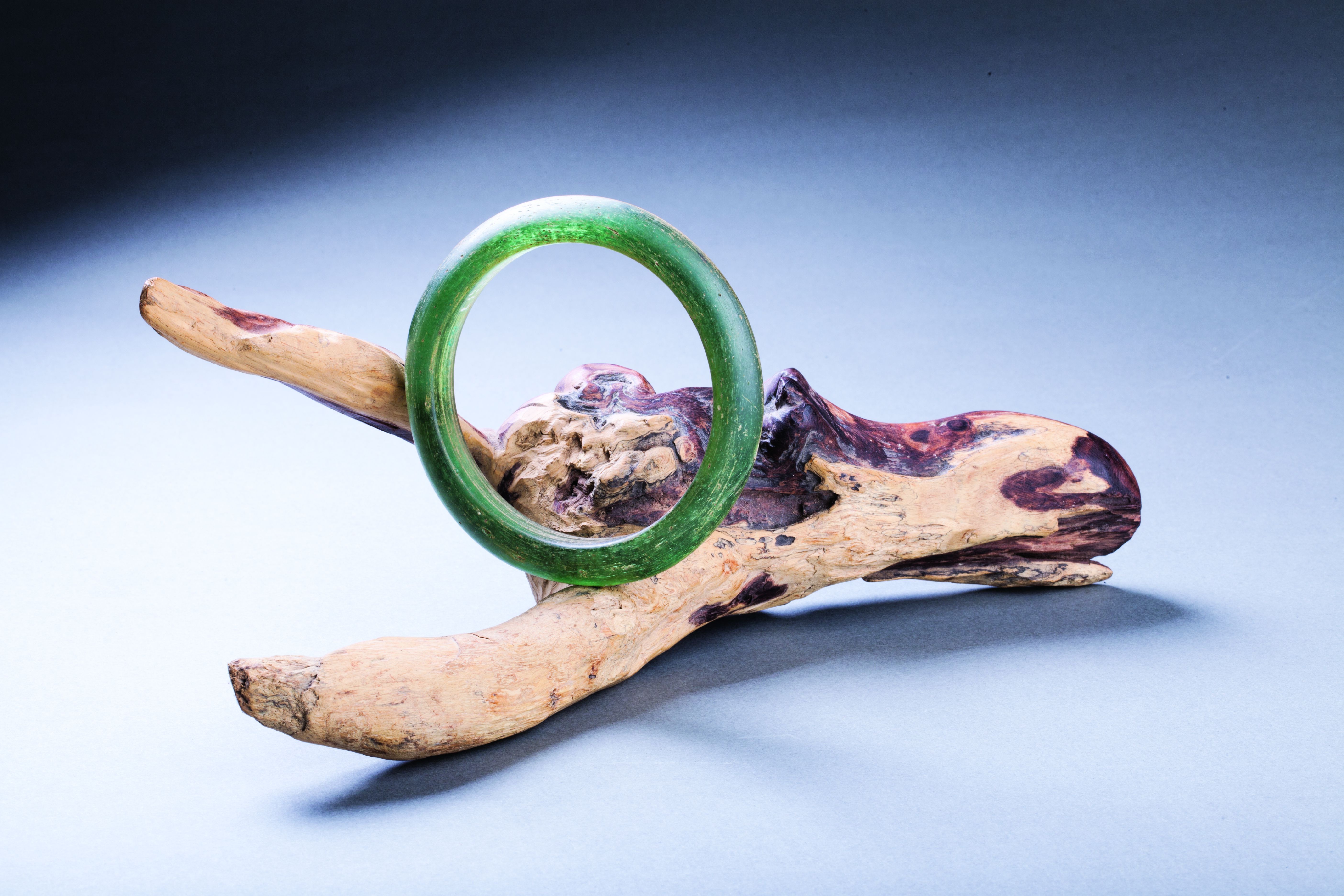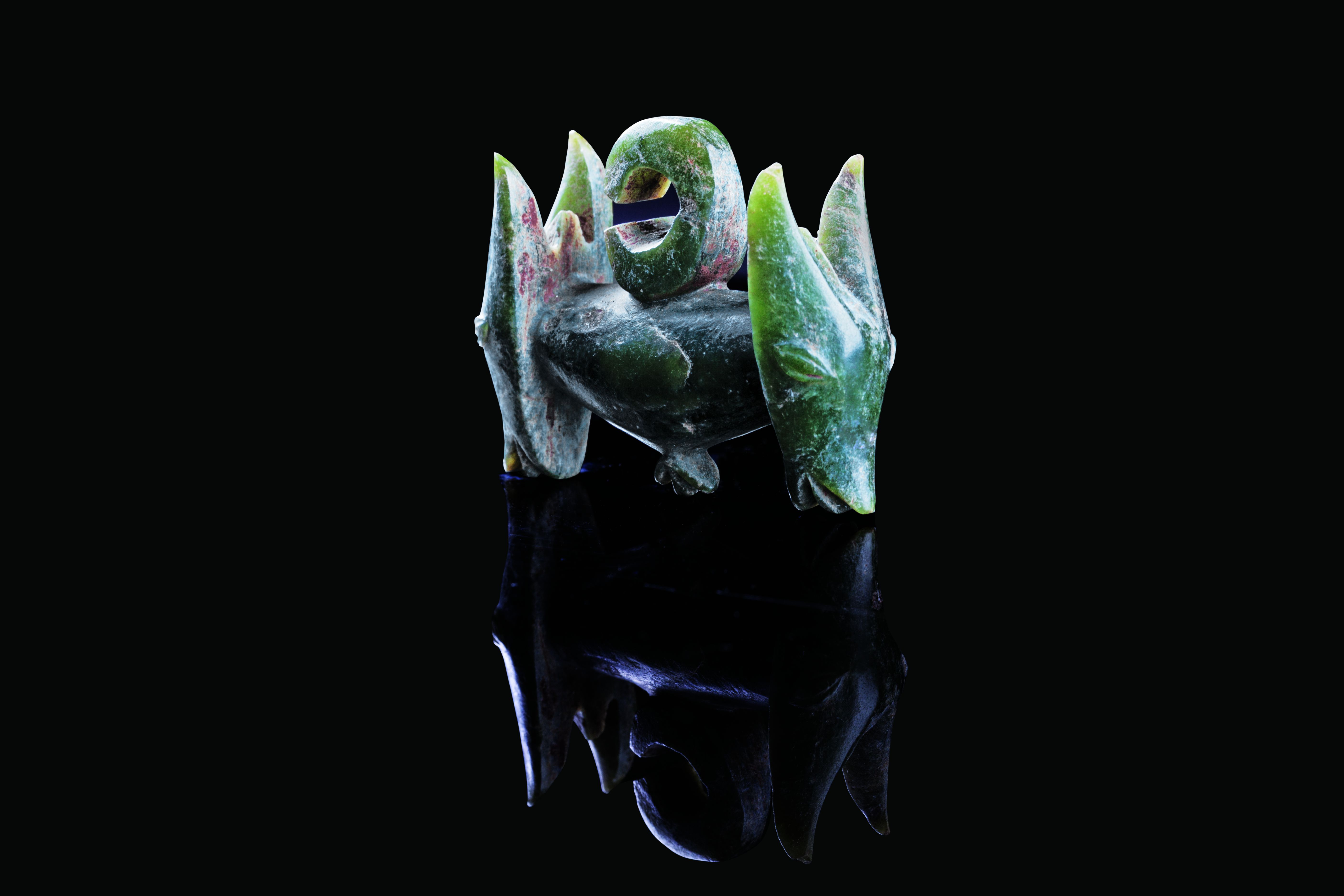 Độc đáo nhất là loại khuyên tai “hai đầu thú” bằng đá ngọc và thủy tinh được tạo hình có hai đầu thú ngược chiều nhau, ở giữa thân là móc đeo vào tai. Đầu thú có hai sừng, mặt thon, miệng nhô ra, mắt to mí mắt rõ ràng. Sưu tập gần 30 chiếc có hình góc cạnh vuông vắn hay nhiều đường cong uốn lượn mềm mại, các đường nét chạm khắc tinh tế và sắc sảo, miêu tả đầy đủ những bộ phận như sừng, mắt, miệng một cách sinh động, chứng tỏ khuyên tai hai đầu thú được chế tác thủ công đơn chiếc nên có sự đa dạng và độc đáo trong từng sản phẩm. Loại khuyên tai này được tìm thấy trong cả mộ người nam và người nữ ở độ tuổi trung niên đến già, thường được chôn cùng với nhiều đồ tùy táng quý giá. Chắc hẳn đây là mộ của những người giàu có hoặc có địa vị quan trọng trong cộng đồng cư dân đương thời.