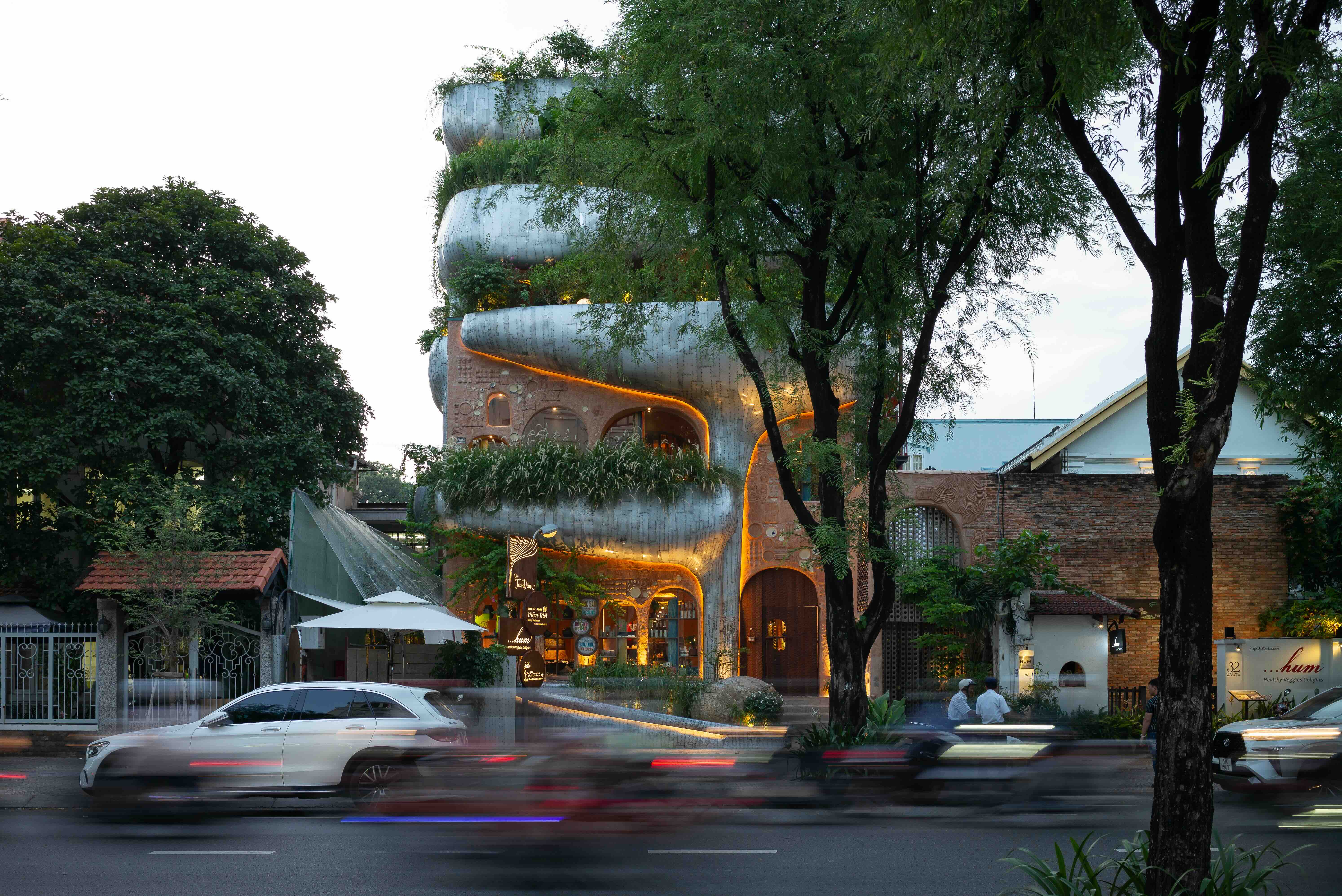 Ngay giữa trung tâm Sài Gòn, Vườn Tao Đàn – công trình HumVentures kiến tạo cùng kiến trúc sư của a21 Studio và Atelier Tho.A là một minh chứng rõ nét. Từ khối bê tông vuông vức, khép kín, toà nhà được “đánh thức” từ cảm hứng hình ảnh cây nấm sau cơn mưa: vươn mình căng tràn sức sống. Những bồn cây kim loại uốn cong, phủ khế, lựu, cỏ lau… khiến khối thép tưởng khô lạnh trở nên duyên dáng, hoà nhịp mềm mại cùng căn biệt thự Pháp cổ kính bên cạnh, hợp thành một tác phẩm nghệ thuật đương đại, mạnh mẽ mà trữ tình.