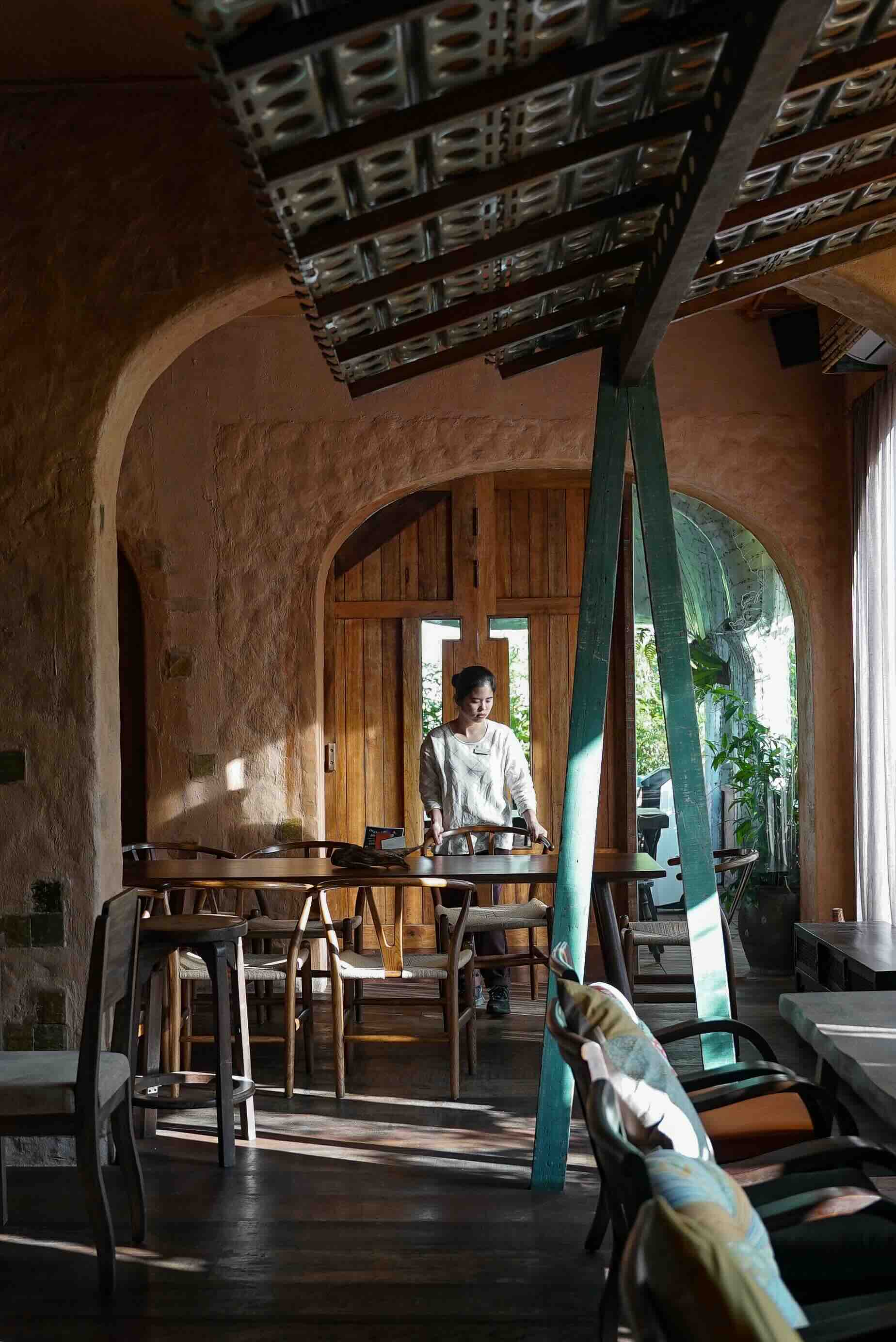 Điểm độc đáo còn nằm ở lớp “ký ức vật liệu”. Mảnh gỗ bạc màu thời gian, tấm ri sắt nhuốm dấu xưa, khối phù điêu tháo dỡ từ công trình cũ,chén dĩa gốm trong mẻ nung lỗi…từng là phế liệu, nay trở thành điểm nhấn mỹ thuật trong kiến trúc và nội thất. Vật vô tri được trao đời sống mới, giữ ký ức, cũng góp phần kiến tạo sự bền vững, vừa gần gũi, vừa giàu chất thơ.
