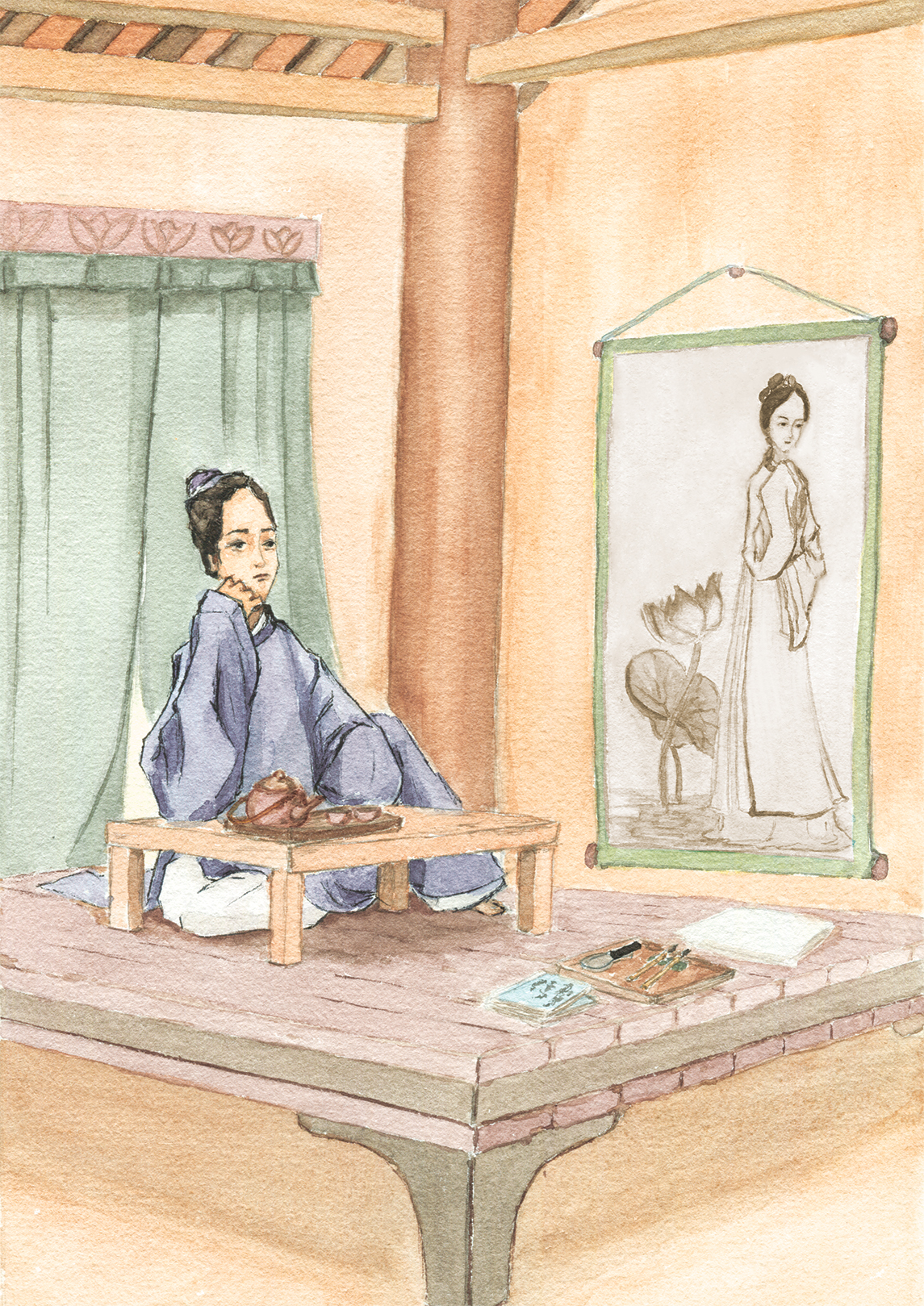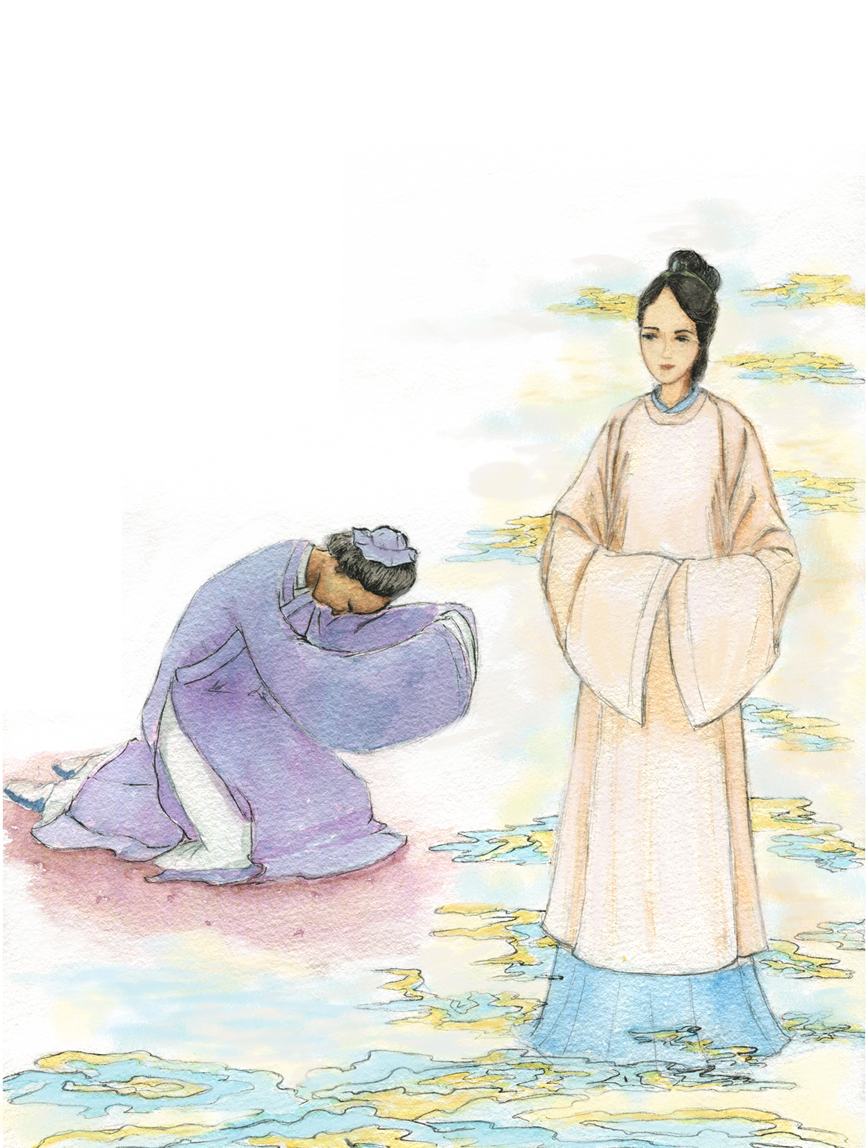 Hôm sau, chàng y hẹn đến cầu Đông. Đợi mãi chẳng thấy ai cả, cuối cùng mới gặp một ông già bán tranh, ông đưa tới mời chàng một bức tố nữ. Chàng mở ra xem thì không ngờ hình dạng người tố nữ trong tranh trông chẳng khác gì người mà mình mong đợi. Chàng mua ngay, đem về treo bên cạnh chỗ ngồi. Đến bữa ăn chàng dọn ra hai đôi đũa, hai cái bát mời người trong tranh ăn như mời người thật. Chàng hơi ngạc nhiên cảm thấy tố nữ trong tranh hai má đỏ bừng dường như có ý thẹn.