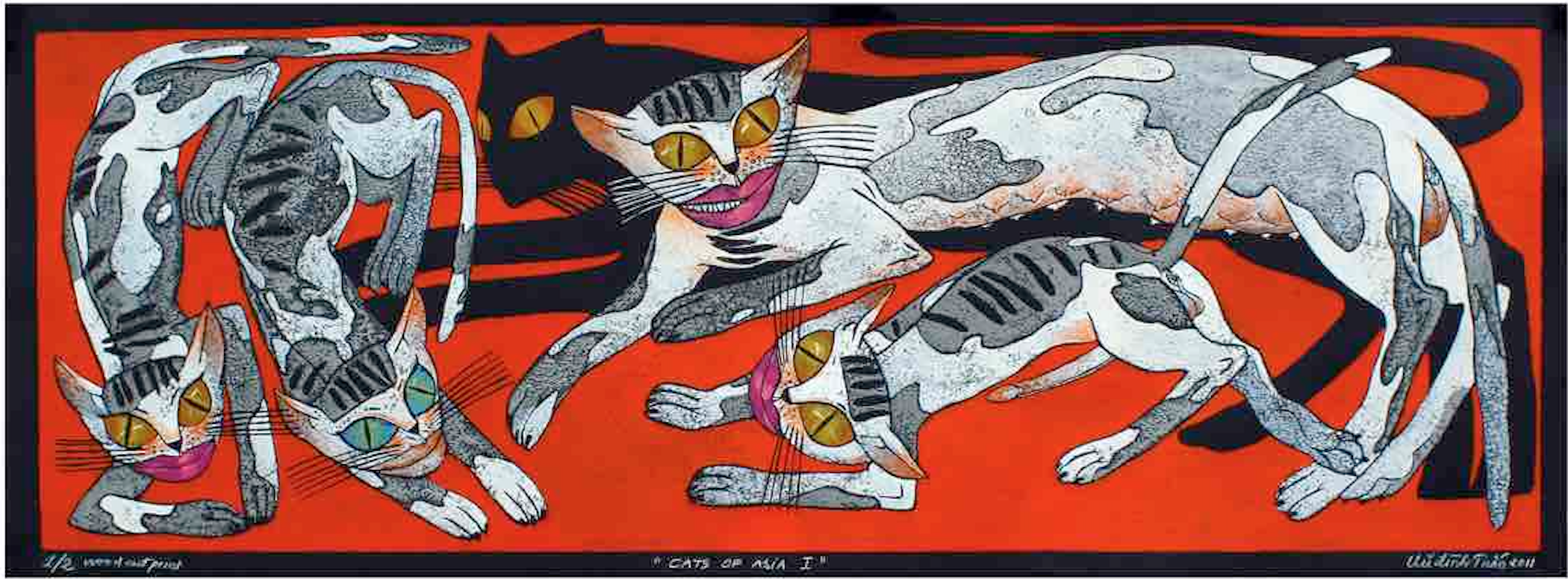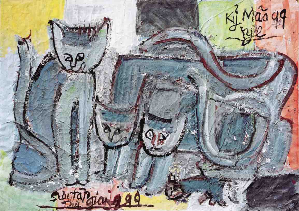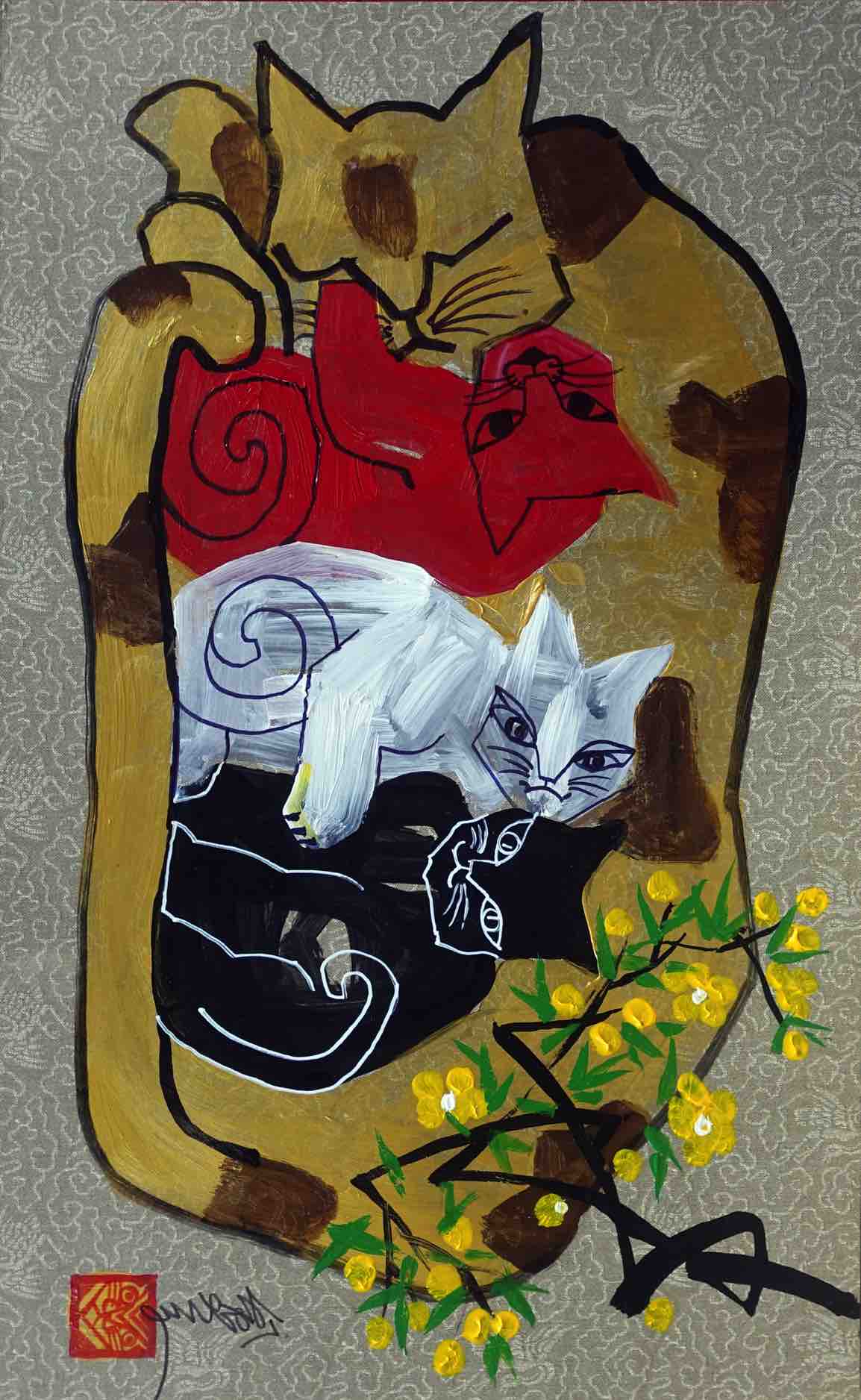 Trong làng mỹ thuật Việt Nam cũng có họa sĩ Phạm Viết Hồng Lam nổi danh với các bộ tranh con giáp đầy màu sắc trang trí. Có những họa sĩ còn đầu tư sáng tác tranh con giáp thành bộ tác phẩm hoàn chỉnh, như bộ tranh khắc gỗ của họa sĩ Vũ Đình Tuấn, được vẽ kéo dài trong nhiều năm, với nhiều phiên bản in độc đáo. Với họa sĩ Tô Chiêm, khi vẽ con giáp, ông thường để ý tớihình thể và đặc tính của từng loài vật, bởi đó là điểm nhận biết ban đầu, sau mới đặt ý tưởng vào tranh. Mới đây, họa sĩ Lê Trí Dũng đã cho ra mắt bộ tranh con giáp Quý Mão với bảng màu ngũ hành. Ông cho biết, theo quan niệm dân gian, mèo là một linh vật quí, đem lại những điều may mắn, tốt lành. Mèo tượng trưng cho đức tính bền bỉ, kiên trì, khéo léo và nhẫn nại. Phong thủy cho rằng những điều ấy đánh tan được tà khí Những bức tranh mèo Quý Mão 2023 họa sĩ vẽ về sự xum họp gia đình, về tình mẹ, về ngũ hành mèo, nhằm gửi đến lời chúc một năm may mắn và hạnh phúc. Nếu hiểu con giáp biến động theo ngũ hành, thì sự thể hiện của các họa sĩ chắc sẽ càng sâu sắc và phong phú, thú vị hơn nhiều. Khi các tìm tòi trong tạo hình, lại cộng thêm hiểu biết về ý nghĩa của thiên can và địa chi với vận động huyền bí của ngũ hành, thì bức tranh con giáp sẽ có thêm giá trị dự báo nữa.