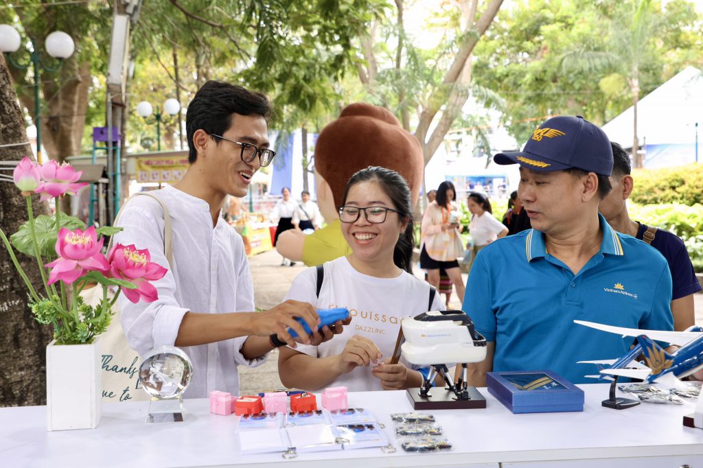 Bước vào gian hàng Vietnam Airlines Group, khách tham quan sẽ được hòa mình vào không khí sôi động với các hoạt động mini game vui nhộn; hoá thân thành phi công thực thụ với “Thử thách lái máy bay” bằng mô hình game giả định. Ngoài ra, khách hàng còn có cơ hội tìm hiểu về các chương trình tư vấn tuyển dụng, khuyến mãi kích cầu; tải app, đăng ký thẻ hội viên của Vietnam Airlines; trải nghiệm ẩm thực trên không mới lạ; tham gia chương trình Vòng quay may mắn với cơ hội trúng thưởng các phần quà hấp dẫn…
