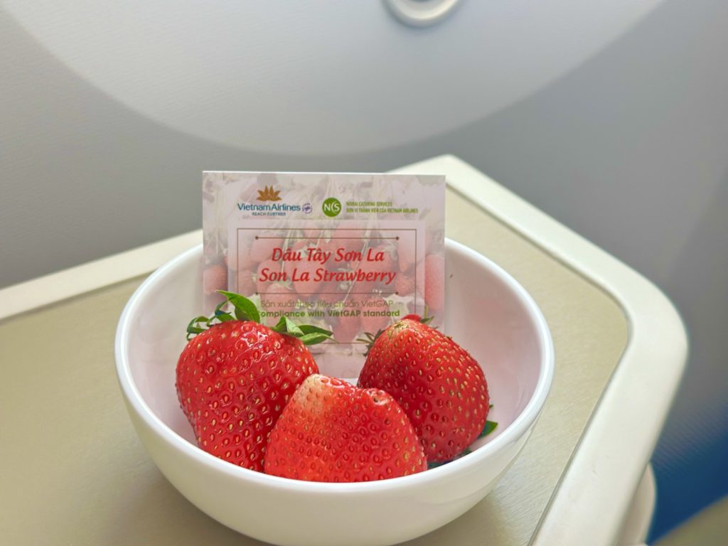Vietnam Airlines đang phục vụ nhiều món ăn mới trên chuyến bay lấy cảm hứng từ trái dâu tây Mộc Châu tươi ngon.