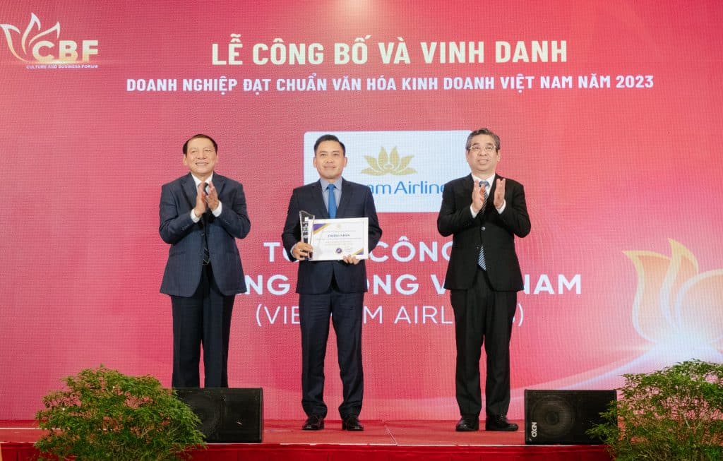 Trong khuôn khổ Diễn đàn quốc gia thường niên “Văn hóa với Doanh nghiệp” lần thứ ba năm 2023 với chủ đề: “Văn hóa kinh doanh dòng chảy phát triển và hội nhập”, Tổng công ty Hàng không Việt Nam (Vietnam Airlines) được vinh danh là “Doanh nghiệp đạt chuẩn Văn hoá kinh doanh Việt Nam” năm 2023.