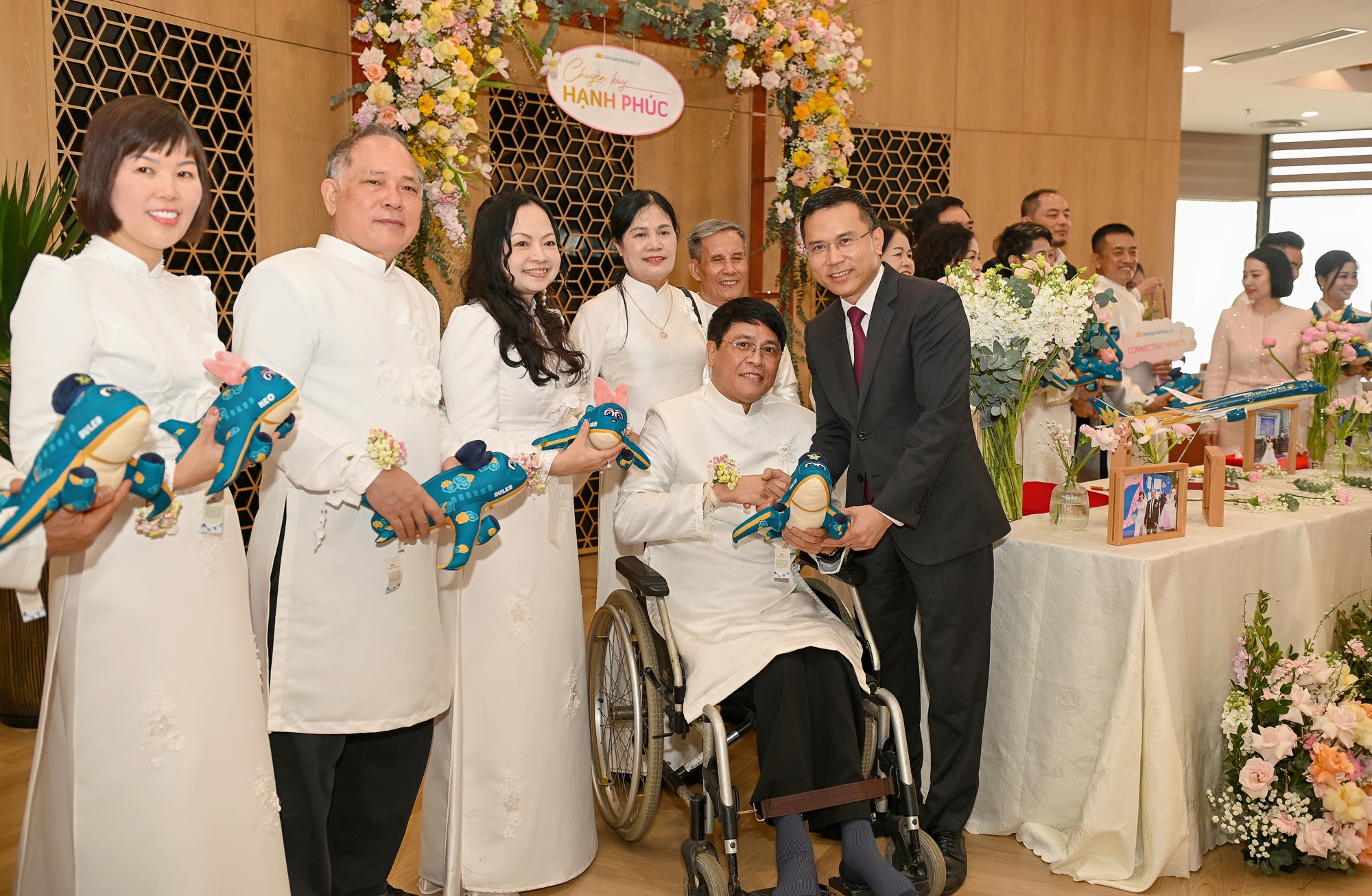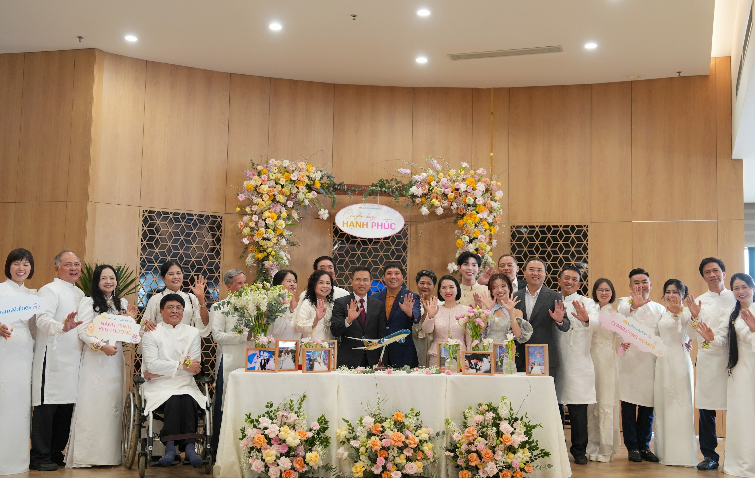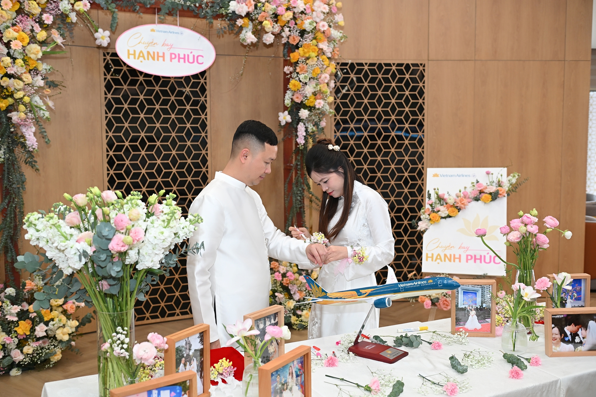Tại phòng khách Bông Sen, 19 cặp đôi tham gia chuyến bay được Vietnam Airlines trao tặng cặp Mascot như một lời chào đón thân tình. Không gian phòng chờ quen thuộc bỗng trở nên ấm áp hơn khi những nụ cười, ánh mắt và câu chuyện đời thường dần kết nối các hành khách với nhau.