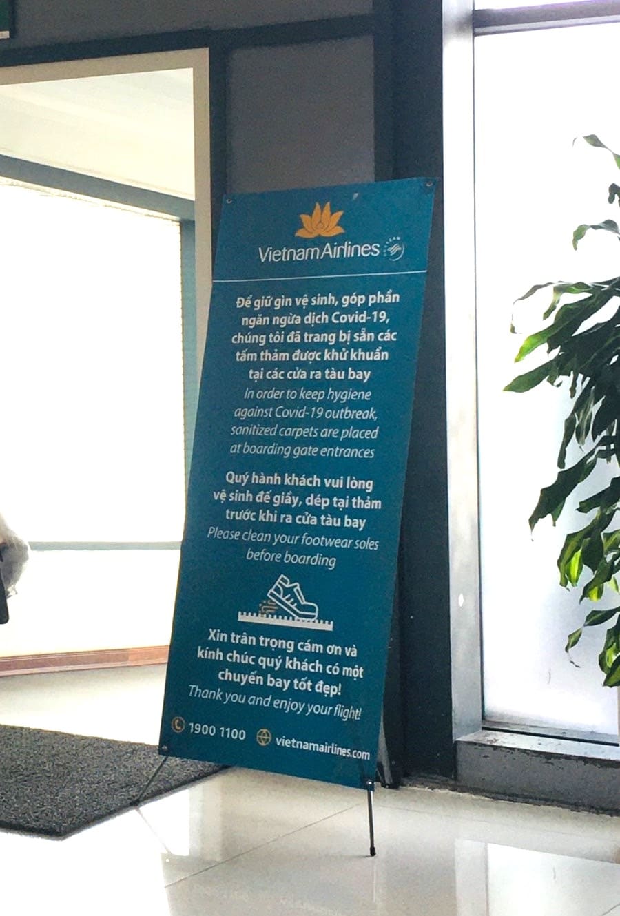 Tại sân bay, Vietnam Airlines thực hiện giãn cách hành khách ở khu vực làm thủ tục, Phòng khách Bông Sen và lắp đặt thảm phun dung dịch khử khuẩn để hành khách bước qua tại cửa lên máy bay.