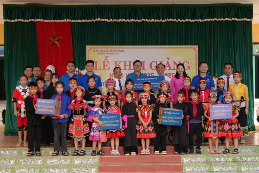 Lễ khai giảng tại Trường Tiểu học 19-8 diễn ra trong không khí trang trọng, rộn ràng với cờ hoa, trống trường và những nụ cười háo hức của học sinh ngày đầu năm học. Trong phần nghi thức, đại diện Vietnam Airlines đã trực tiếp bàn giao thư viện và quà tặng cho nhà trường, gửi gắm mong muốn đồng hành cùng thầy trò trong việc xây dựng môi trường học tập thân thiện, khích lệ tinh thần hiếu học của các em nhỏ vùng khó khăn.
