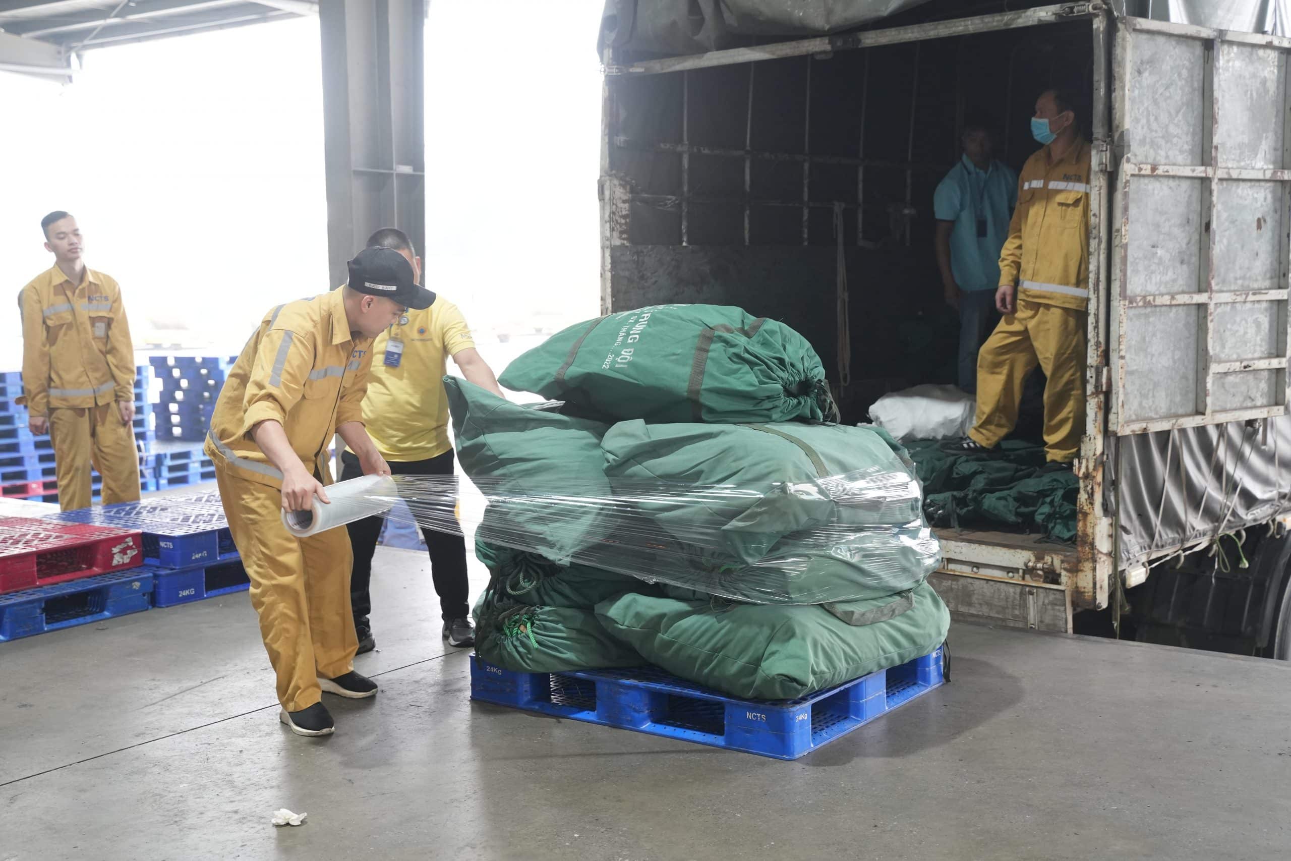 Ngay từ sáng sớm, xe chở hàng cứu trợ của các đơn vị thuộc Bộ Quốc phòng và Bộ Công an Việt Nam đã tập kết tại kho hàng của Vietnam Airlines ở Nội Bài, chuẩn bị cho việc xử lý và vận chuyển tiếp theo.