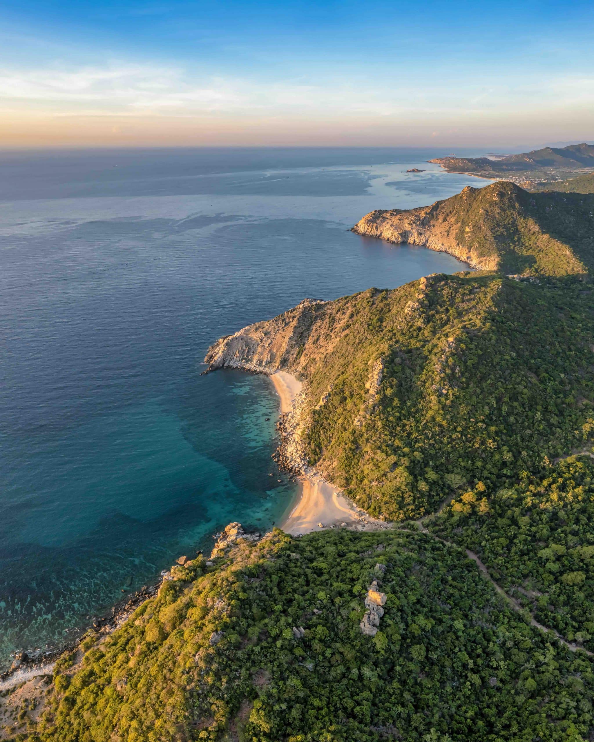 Chúng tôi dậy từ rất sớm nhen lửa đun nước pha cafe, ngồi đợi mặt trời. Vầng thái dương đang còn “lặn” dưới biển, dương quang của nó đã hắt lên vàng rực ở chân trời đằng đông, dần phân chia lại ranh giới giữa trời và biển – vốn đã bị xóa nhòa vào đêm hôm trước. Tạo hóa diệu kỳ khiến cho các mảng màu của thiên nhiên trong thời khắc bình minh biến đổi theo từng giây phút, khiến chúng tôi ngắm không chớp mắt, ly cafe nguội ngắt từ lúc nào không hay. Và rồi quả cam vàng rực từ từ nhô lên ở đường chân trời, hắt lên không trung một dải sáng chói lòa rực rỡ hình chữ V với 2 bên cánh hồng rực, mờ dần lẫn vào nền trời xa đang hửng lên mở ra ngày mới. Ngắm mặt trời trồi lên khỏi mặt biển, tôi phóng mắt nhìn khắp không gian xung quanh và lại sững sờ với vẻ đẹp mê ly. Mặt biển phản chiếu bầu trời, tạo thành hai mặt phẳng xanh thẳm, giao nhau tại đường chân trời vàng rực, thẳng tắp. Vài vầng mây trắng mỏng trên trời cùng mấy dải sóng gợn nhẹ trên mặt biển càng điểm xuyết cho bức tranh trước mắt trở nên hoàn hảo. Và nữa, ánh ban mai vàng ươm như mật tưới đẫm xuống những cánh rừng trên sườn núi Chúa, khiến tán lá rừng xanh biếc trở nên lấp lánh như những ánh mắt cười đón chào ngày mới. Những bãi cát mịn cong cong hình vòng cung với hai bên vách núi sáng tối tương phản, giống như thiếu nữ xinh đẹp xõa tóc e ấp che bớt một phần gương mặt.