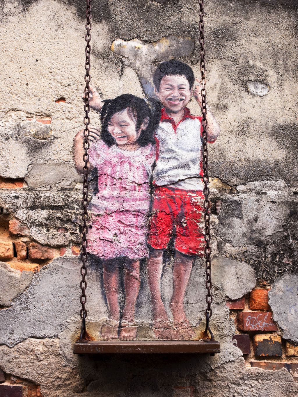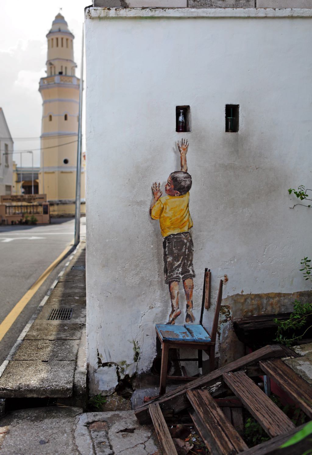 Chắc chắn là người ta biết đến Penang nhiều hơn sau khi serie tranh tường của họa sĩ trẻ người Latvia Ernest Zacharevic được thực hiện tại khu phố cổ George Town, và trở nên nổi tiếng trên mạng xã hội. Dự án tranh tường Mirrors George Town của Ernest là một phần trong Lễ hội George Town Festival 2012, do chính quyền tài trợ. Khi tác phẩm nổi tiếng nhất “Little Children on a Bicycle” (những đứa trẻ trên chiếc xe đạp) trong dự án này hoàn thành, ngay lập tức nó đã giúp Penang và Ernest Zacharevic được ghi dấu trên bản đồ nghệ thuật đường phố của thế giới. Cho tới nay, các bức tranh tường vẫn tiếp tục được Ernest thực hiện (lần vẽ gần nhất là tháng 2/2014), cùng các sáng tác của nghệ sĩ địa phương khác. Các họa sĩ đã thật sự sáng tạo khi sử dụng và phối hợp ăn ý các hình vẽ với những hình khối, màu sắc tự nhiên của các mảng tường nhà, đồng thời kết hợp với các vật dụng thật như cái xe đạp, xe máy, cái ghế, quang gánh, cái cây…, và luôn dành một khoảng trống để người xem được cùng tham gia vào tác phẩm. Phải nói đây là những tác phẩm sắp đặt – trình diễn – tương tác hoàn hảo, và quan trọng nhất là chúng luôn được làm mới với các nhân vật – du khách đường phố. Chúng mang lại sự phấn khích cực độ cho du khách từ già đến trẻ. Những bức nổi tiếng như “Little Children on a Bicycle” “Boy on a Bike” (Cậu bé trên xe máy), hay “Little Boy with Pet Dinosaur” (Đứa trẻ và con khủng long),… đã trở thành những hình ảnh điển hình của du lịch Penang, và chúng được tái hiện lại trên các sản phẩm lưu niệm như túi xách, áo phông, sổ tay…
