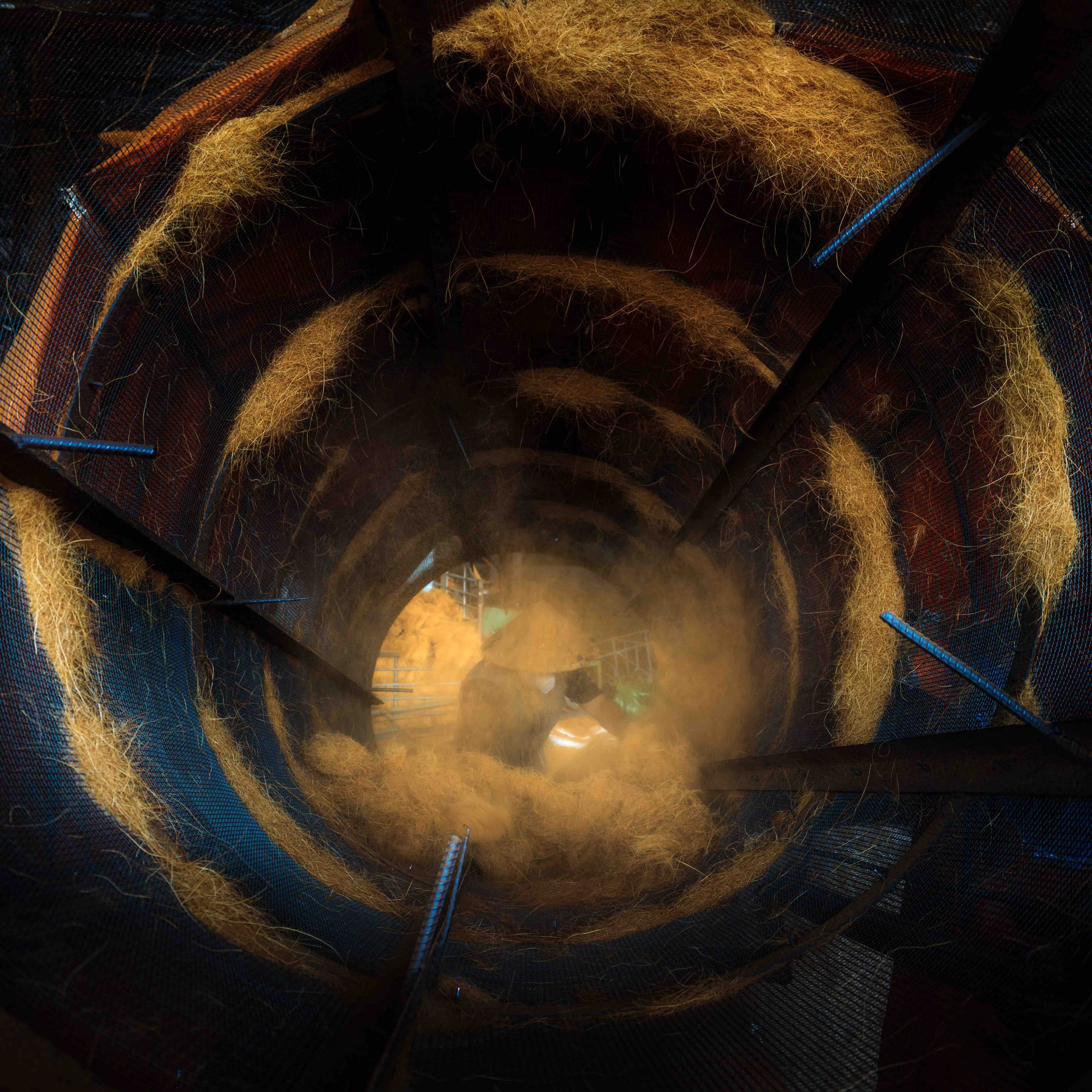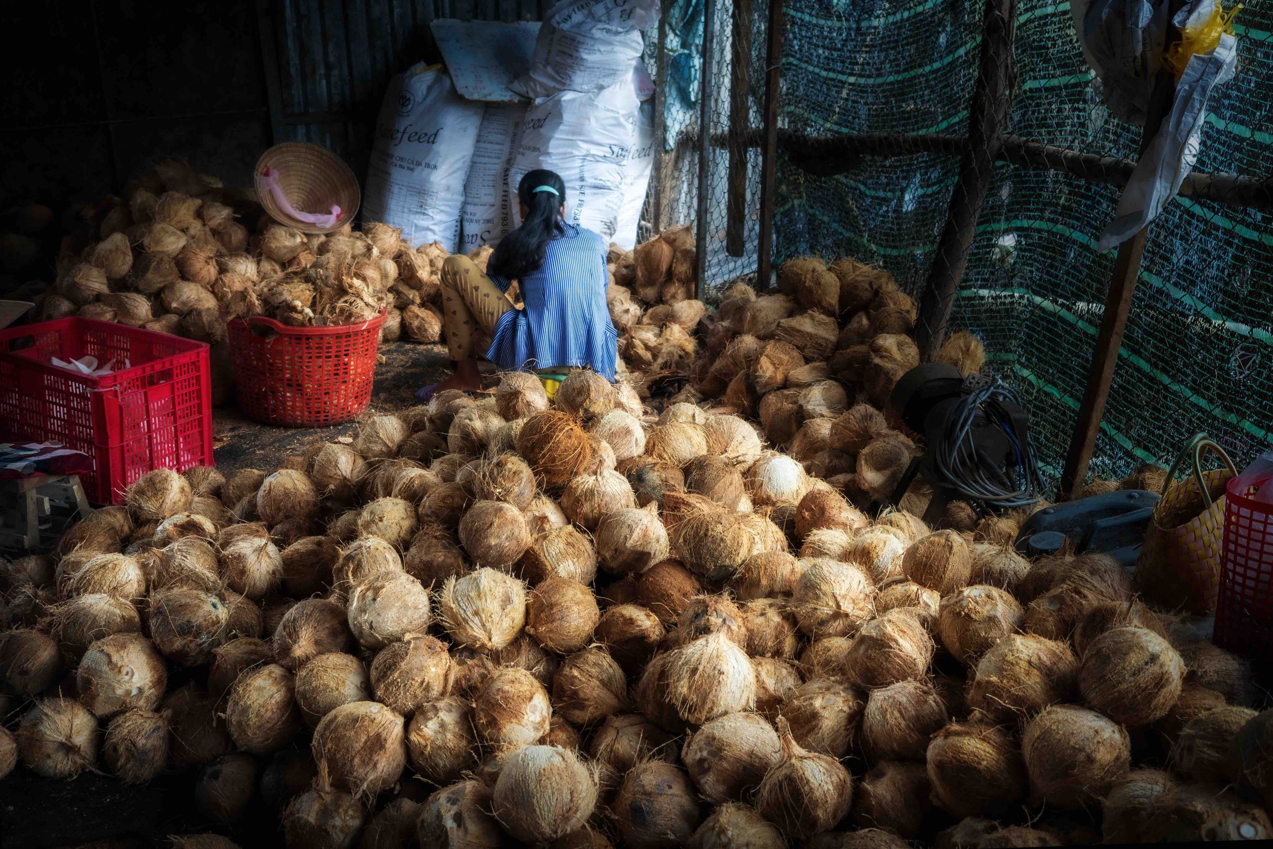 Ở làng nghề, có một công việc được cho là khó nhọc và tương đối nguy hiểm, đó chính là bóc vỏ dừa. Kết cấu của một trái dừa khô rất chắc nên để bóc được nó một cách nhanh chóng, thường phải là đàn ông trên 30 tuổi có sức vóc và sự nhanh nhẹn mới đảm nhiệm được. Người ta phải ném mạnh trái dừa vào mũi dao nhọn cắm trên cọc gỗ để vỏ dừa bung ra một phần, rồi gồng hết sức để xé toạc nó ra để lấy gáo dừa bên trong. Sau đó mới đến phần bóc tách cơm dừa bằng cách chẻ đôi gáo dừa, rồi đưa một lưỡi dao chuyên dụng sắc bén và cong, luồn vào khe nhỏ nạo dần từng miếng cơm dừa. Thứ giá trị nhất trong trái dừa chính là cơm dừa vừa được lấy ra sẽ được phân loại cho các nhu cầu sản xuất khác nhau.