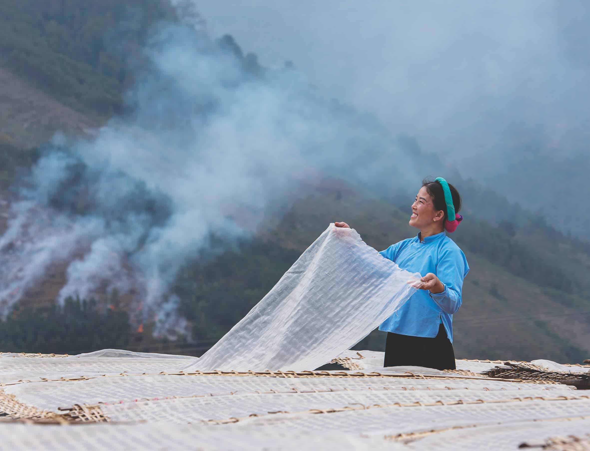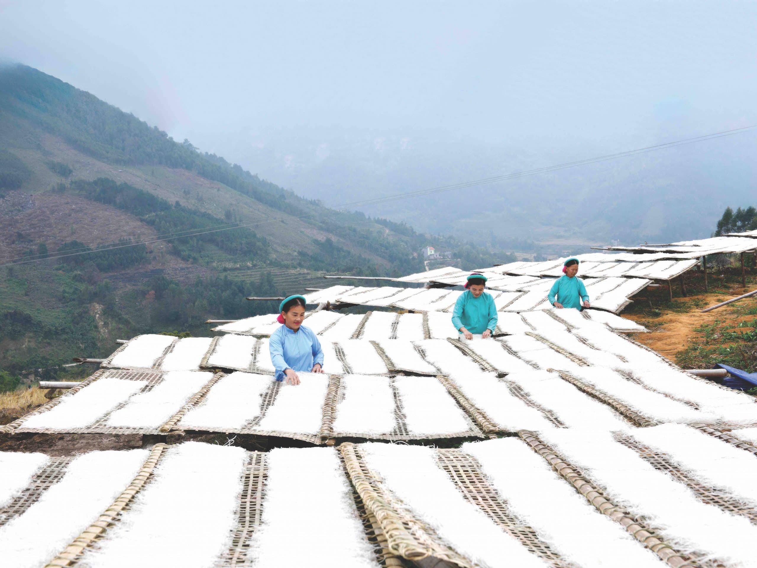 Từ xa, bóng áo xanh váy đen – trang phục đặc trưng của phụ nữ Sán Chỉ đã ẩn hiện giữa núi đồi và thấp thoáng giữa những phên tre phơi miến. Không khí miền cao se lạnh nhưng nắng chan hòa. Cái lạnh khô và nắng ấy phù hợp với công đoạn phơi miến tự nhiên để cho ra được những mẻ thành phẩm chất lượng.
