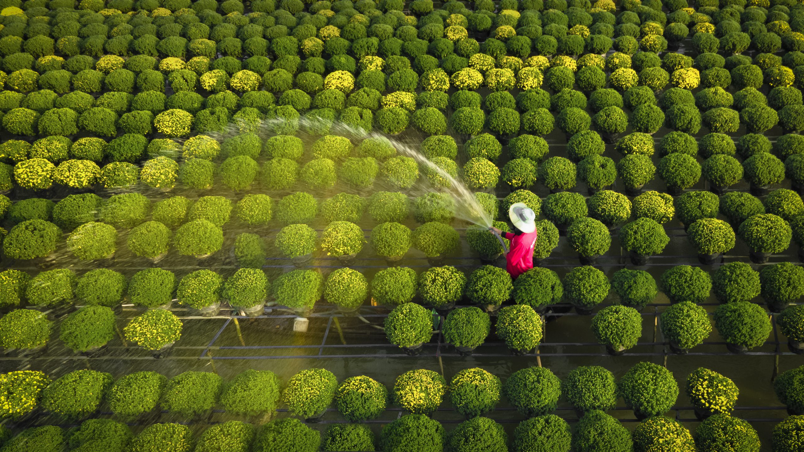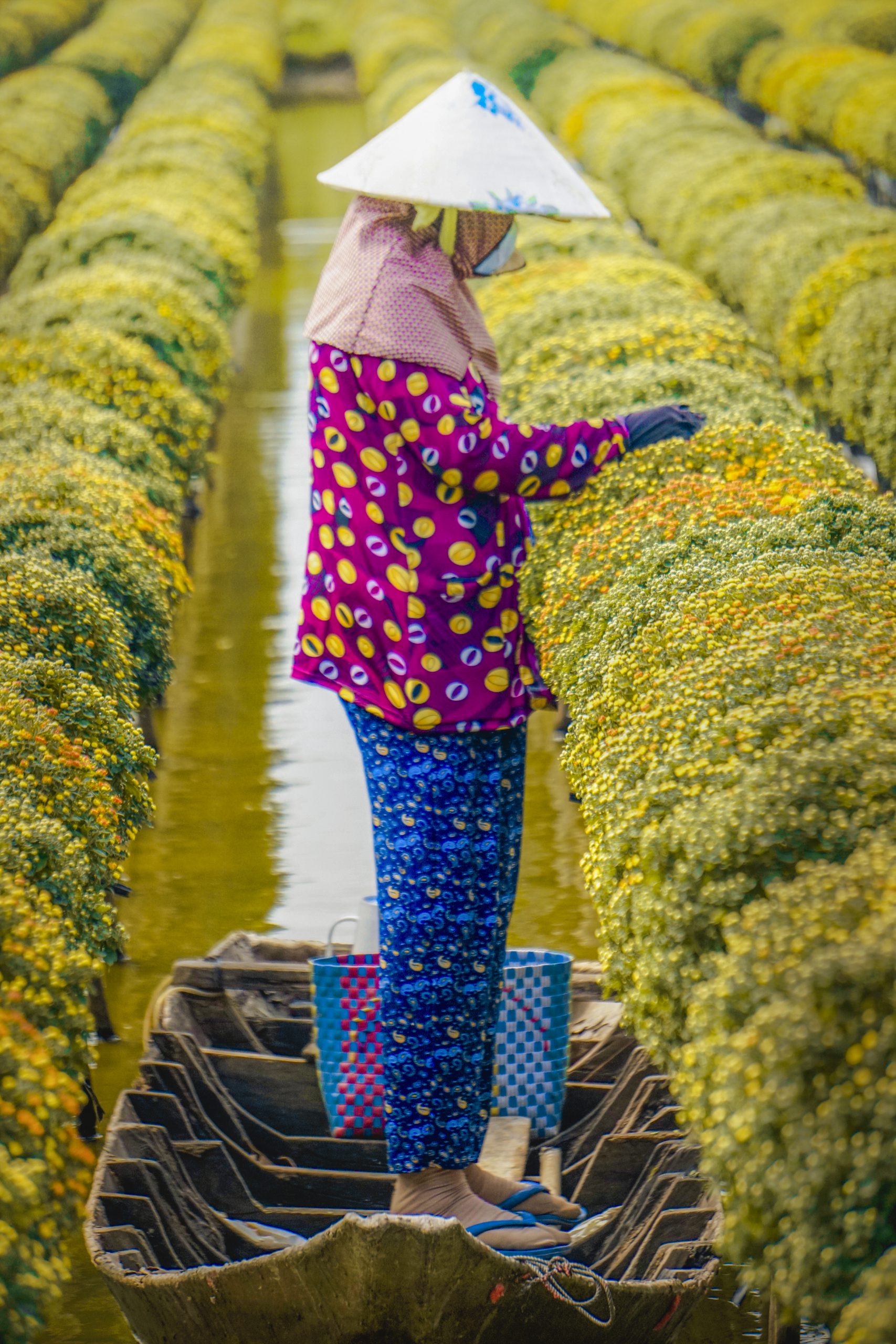 Nét đặc trưng chúng tôi dễ nhận ra ở Sa Đéc là người dân trồng cúc mâm xôi trong chậu đặt trên giàn, bên dưới là ruộng đầy nước thuận tiện cho người dân chèo xuồng tưới hoa. Loài hoa này từ lúc trồng đến khi nở mất khoảng 6 tháng, khi các chậu hoa có nụ màu xanh chuyển sang chớm nở vàng là thời điểm các nhà vườn kỳ công chăm sóc, tích cực dưỡng hoa. Đàn ông chèo xuồng tưới nước vào dưới gốc, tưới phun nhẹ trên luống vào lúc sáng để tránh làm úng hoa; trong khi đó phụ nữ đứng trên thuyền lãi chèo – nhặt bỏ những chồi nhỏ trên các nhánh chính và bông phụ trên từng chậu để tán hoa khi nở không bị lép.