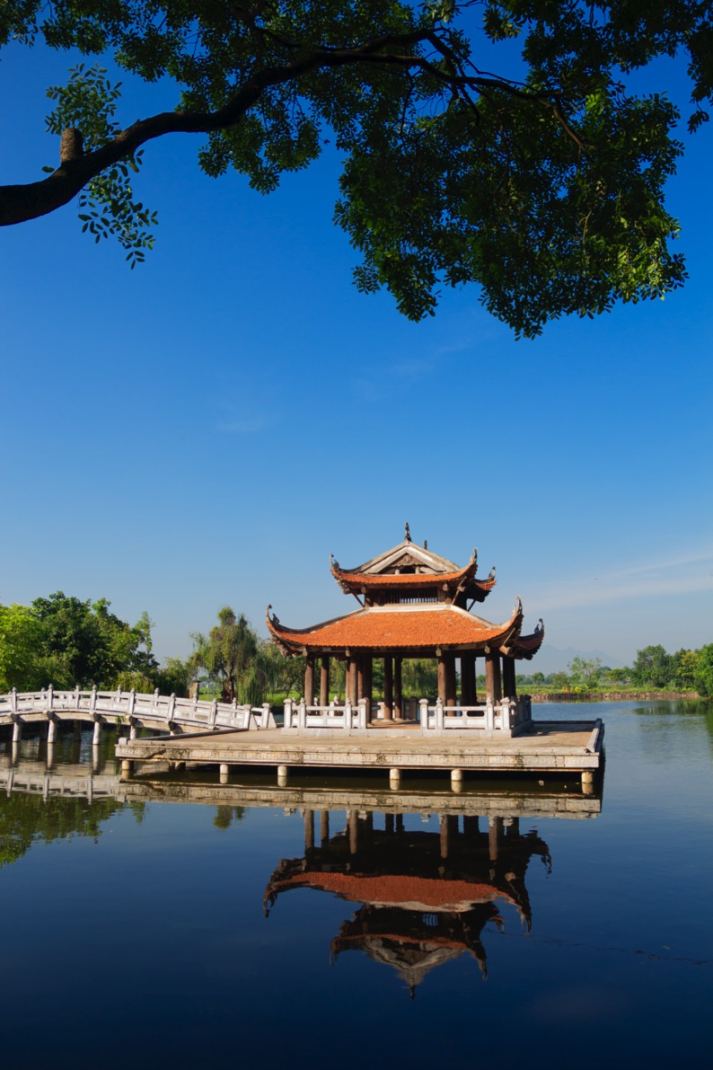 Sông Hồng bắt đầu chảy vào địa phận ngoại thành Hà Nội từ ngã ba Trung Hà, nơi sông Đà uốn khúc nhập dòng. Đây cũng là vùng đất cổ của người Việt từ nhiều thiên niên kỷ, nằm ở phía Tây kinh thành Thăng Long từ xưa được phân định là trấn Sơn Tây, còn gọi là xứ Đoài. Con sông Hồng chảy qua đất Ba Vì, Sơn Tây, hợp với núi Tản Viên, ngọn linh sơn của người Việt cổ thành một thế sơn thủy hữu tình. Ven dòng sông là những ngôi đình làng nổi tiếng đã làm nên danh tiếng vùng đất trong câu phương ngôn: “Cầu Nam, chùa Bắc, đình Đoài”, đó là những ngôi đình xếp vào hàng di tích quốc gia như Tây Đằng, Chu Quyến, Thụy Phiêu có tuổi đời cách đây 500 năm… Đình làng xứ Đoài, nơi tụ họp của cư dân, thừa kế cấu trúc những nhà sàn vùng bán sơn địa với hệ cột gỗ lim khổng lồ, sàn cao cách mặt đất để tránh lũ và côn trùng, hệ mái đặc trưng kiểu “thượng rường hạ kẻ” đỡ lấy lớp ngói đồ sộ với những mái đao cong vút lên như mũi thuyền trên đồng lúa hay dòng sông. Màu nâu trầm của mái đình bên con đê xanh mướt cỏ, dưới bóng cây gạo hoa nở đỏ chói, đã thành điểm nhấn dọc dòng sông mẹ.