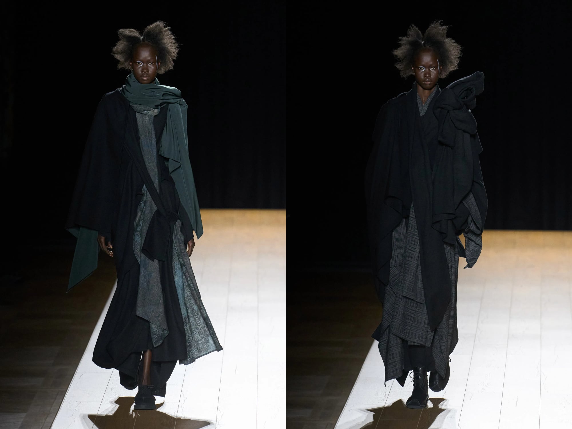 Ở tuổi 82, nhà thiết kế huyền thoại vẫn tiếp tục khai thác những câu hỏi cốt lõi về trang phục: quần áo được tạo nên như thế nào, và làm sao một cấu trúc vải có thể chuyển động cùng cơ thể. Bộ sưu tập Thu–Đông 2026 giống như một chuỗi “nghiên cứu” về kimono, nơi Yamamoto mở rộng rồi thu gọn hình khối truyền thống ấy bằng những động tác drape, buộc, gấp và chồng lớp. Khi người mẫu bước chậm trên đường runway cao, cơ thể họ gần như biến mất bên dưới những lớp áo choàng và váy dài, nhưng trang phục lại không hề gò bó. Vải có thể buộc cao ở vai, thả thấp phía sau lưng, hoặc vắt chéo như khăn choàng; khối lượng vải tụ lại ở một điểm rồi bất ngờ buông ra ở điểm khác. Những quyết định ấy không mang tính kỹ thuật khô cứng mà giống như lựa chọn trực giác của một nghệ sĩ đang vẽ bằng vải.