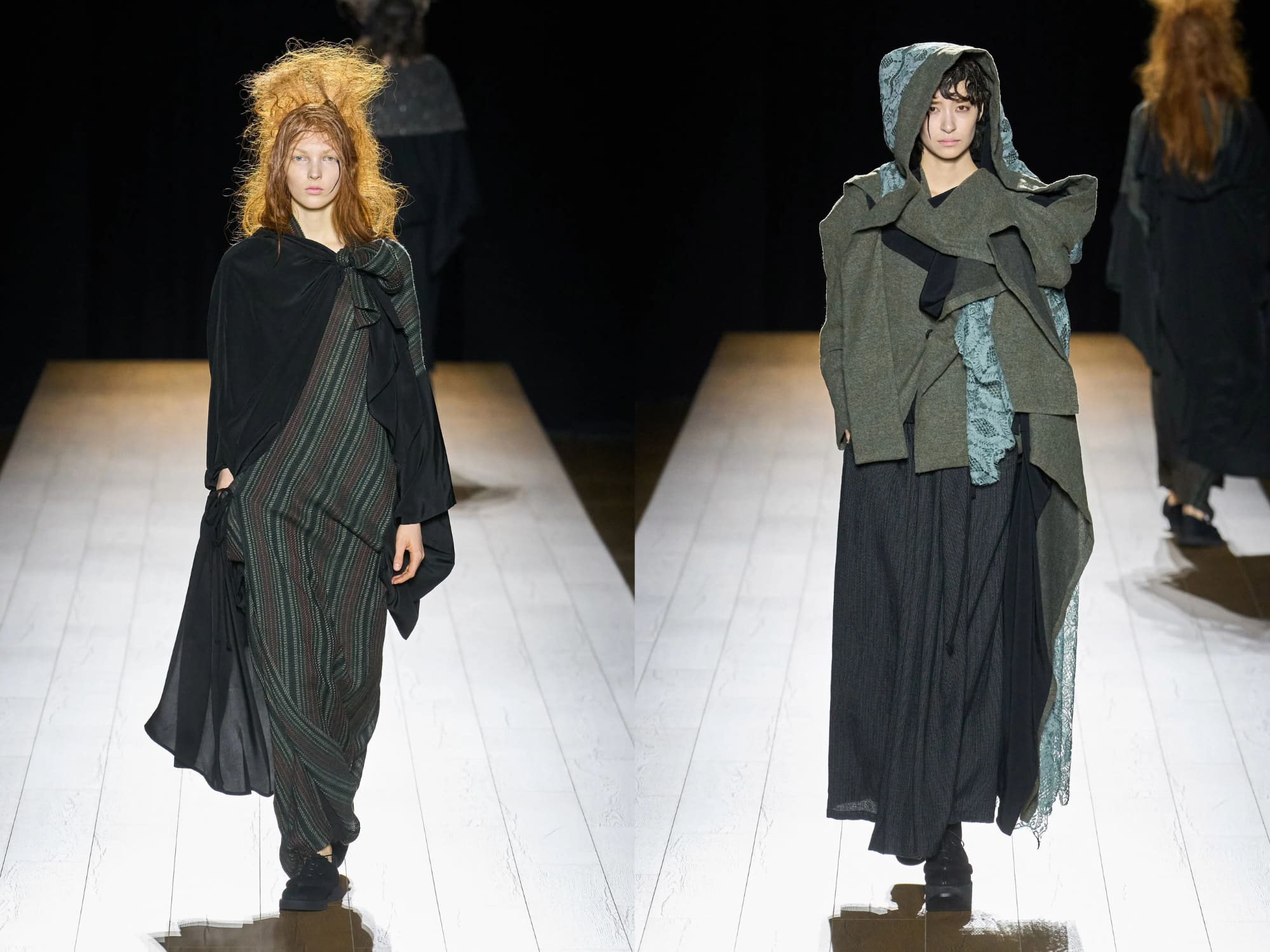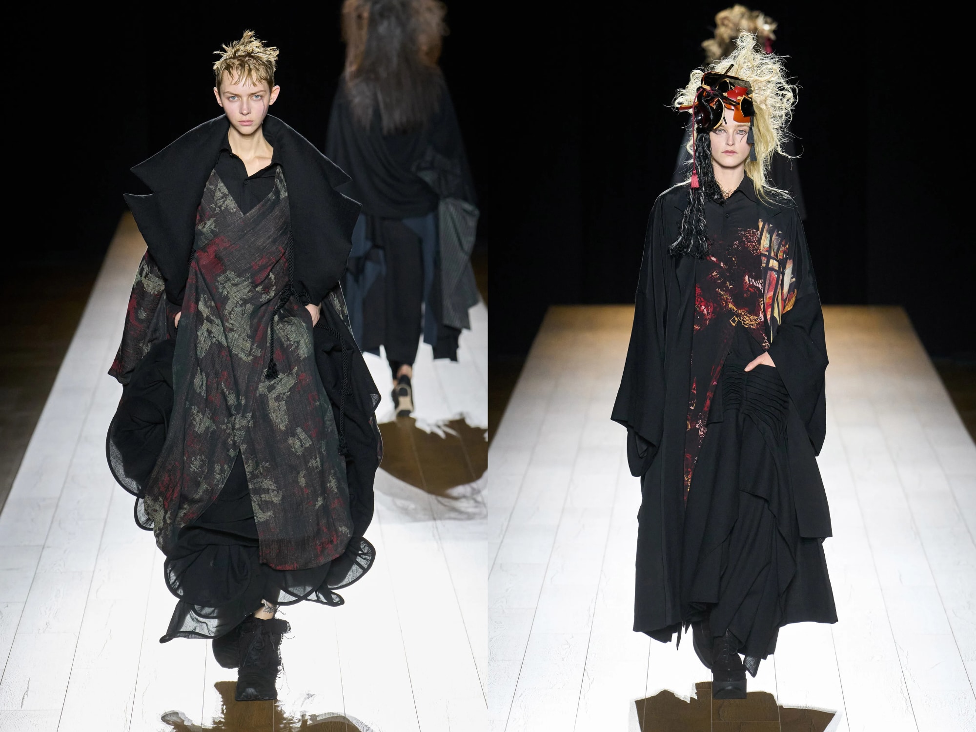 Ở đây, kimono không còn là trang phục truyền thống cố định mà trở thành một cấu trúc mở. Những đường may hầu như biến mất, khiến người xem phải quan sát kỹ mới hiểu cách các lớp vải quấn quanh cơ thể. Yamamoto từng nói rằng nếu không tiếp tục thử nghiệm, ông sẽ cảm thấy nhàm chán; và bộ sưu tập này cho thấy niềm say mê đó vẫn còn nguyên vẹn. Mỗi look giống như một biến thể mới trong hành trình dài của ông với hình khối kimono– một cuộc đối thoại liên tục giữa quá khứ và hiện tại.